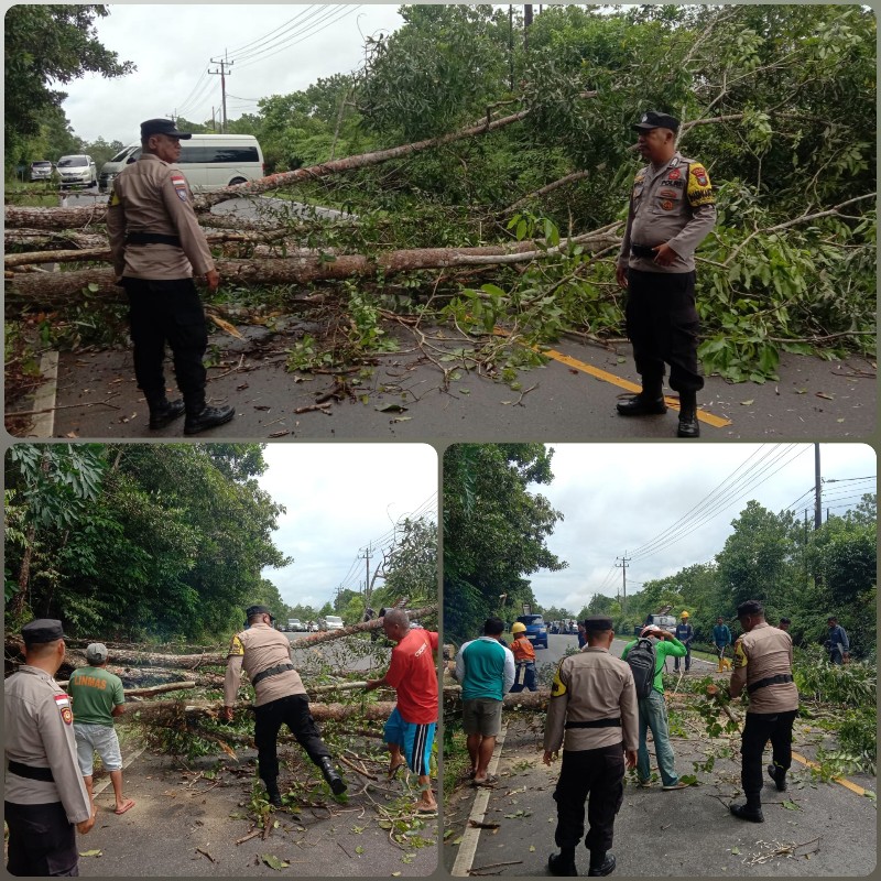 “Setelah mendapat informasi tersebut personel piket pelayanan Polsek langsung ke TKP untuk melalukan pemotongan, namun Bhabinkamtibmas terlebih dahulu sudah tiba di lokasi Pohon tumbang tersebut”. Ujar AKP Satri.