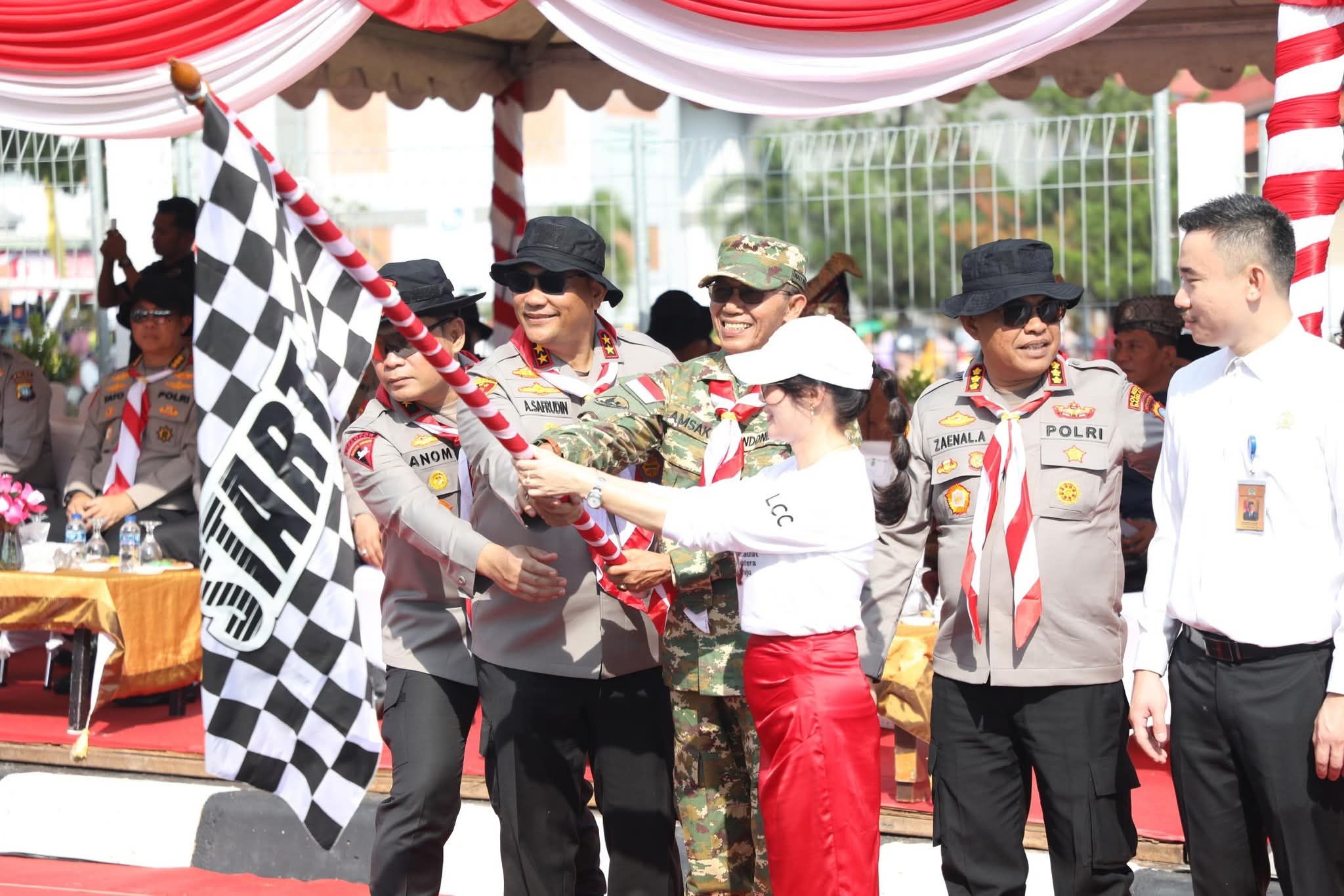 Foto : Ist – Tampak terlihat Walikota Batam Amsakar Achmad bersama Wakil Wali Kota Li Claudia Chandra saat melepas para peserta.pawai hias dan pawai budaya dengan bendera start di bawah panggung kehormatan.(foto : Ist – R/ Dok : Indralis – OpuNg)