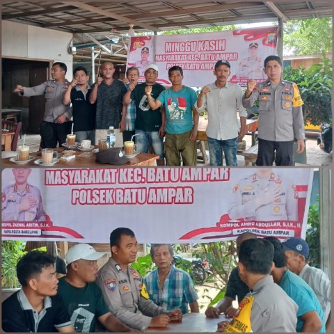 Dan dalam “kegiatan ini bertujuan untuk menampung aspirasi atau masukan dari bapak ibu sekalian, harapan kami kegiatan dalam minggu kasih ini kami jajaran Polsek Batu Ampar, menyampaikan bimbauan dari bapak Kapolda Kepri dan Kapolresta Barelang mari kita jaga kota Batam ,lingkungan kita serta Polresta Barelang menindak tegas segala bentuk Premanisme yang dapat mengganggu investasi di kota Batam dan segala bentuk tindak pidana, kejahatan lainnya, kami jajaran Polsek Batu Ampar Polresta barelang ,terus menjaga keamanan lingkungan bapak ibu sekalian, dan selanjutnya terus waspada tentang kasus kasus curanmor , selalu waspada parkir kendaraan bermotor anda ditempat sudah dianggap aman , gunakan selalu kunci ganda,