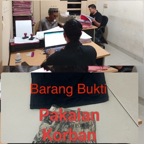 Foto : Ist- Tampak Terlihat Kakek” Durjana” Tua Bangka Cabuli Bocah 4 Tahun saat di periksa pikak polisi diruang Unit Pemeriksaan di lantai 2 , Sedangkan gambar bawah berupa baju dan celana sebagai barang bukti penyelidik saat diperiksa.( foto : Salam Prasisi Kasi Humas Polsek Bengkong.- Polwan Bripda Meta. – R/ Dok : Indralis- OpuNg)