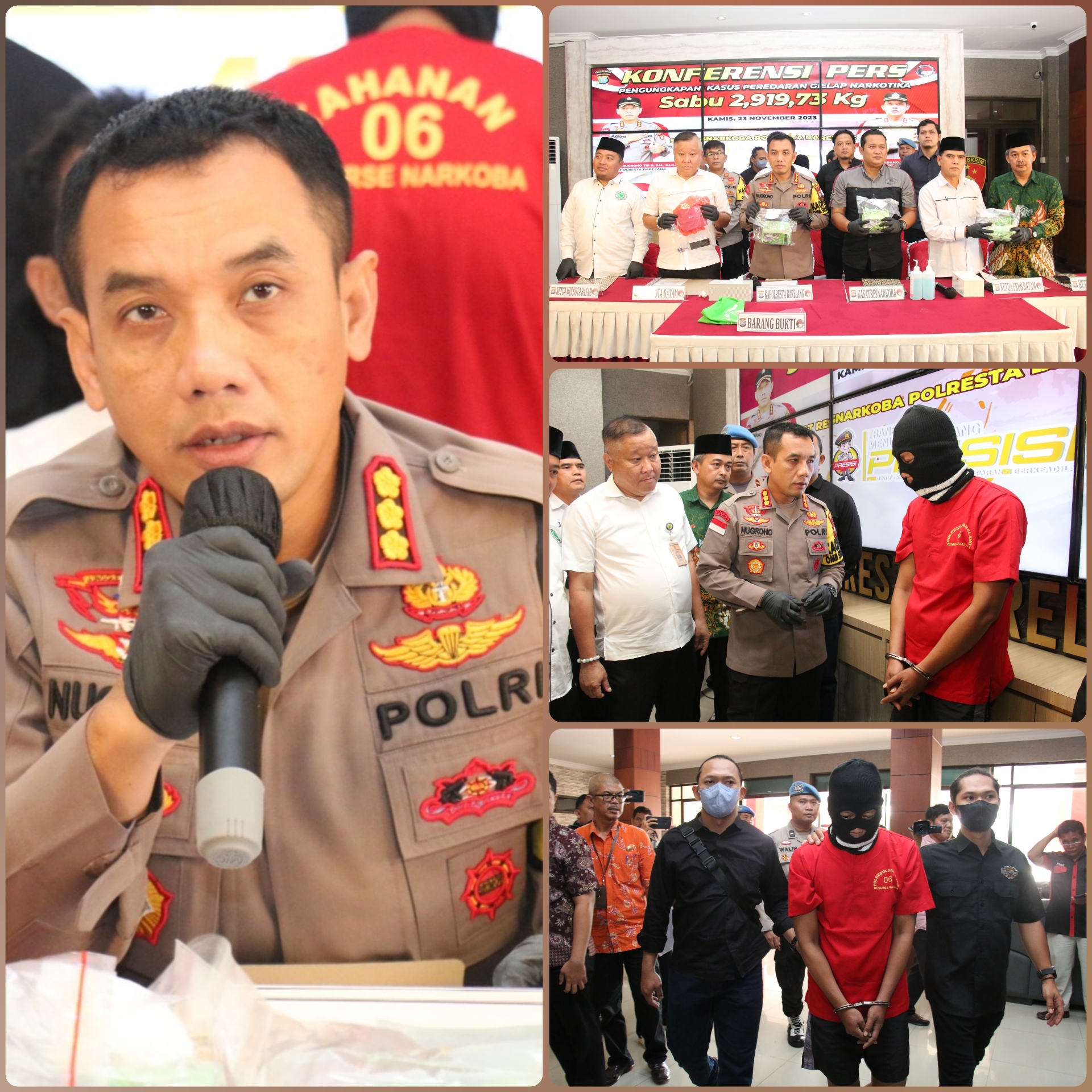 Polresta Barelang. ( BATAM Expose.Com).—– –! Kapolresta Barelang Kombes Pol Nugroho Tri N, SH, SIK, MH menggelar Konferensi Pers Pengungkapan Peredaran Gelap Narkotika seberat 2,919,73 KG yang di dampingi oleh Kasat Resnarkoba Polresta Barelang Kompol Rayendra Arga Prayana, S.I.K., Kasi Humas Polresta Barelang AKP Tigor Sidabariba, SH, MUI Kota Batam, NU Kota Batam, Ketua Komisi Satu DPRD, FKUB Kota Batam bertempat di Lobby Mapolresta Barelang. Kamis (23/11/2023)