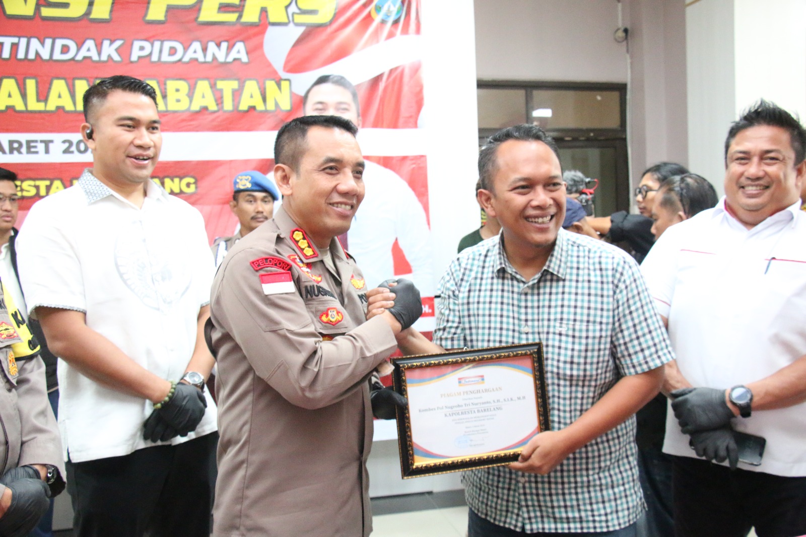 Berterima kasih atas apresisasinya dalam mengungkap kasus ini semoga hal ini tidak terjadi lagi dan dikesmpatan itu Adi Jati Kosumo usai kompresi pers diruang kerja Kapolresta Barelang Adi Jati Kusumo berkesempatan juga menyerahkan piagam penghargaan kepada Kapolresta Barelang Kombes Pol Nugroho Tri N, SH, SIK, MH dan jajaran sebagai bentuk apresiasi atas keberhasilannya.