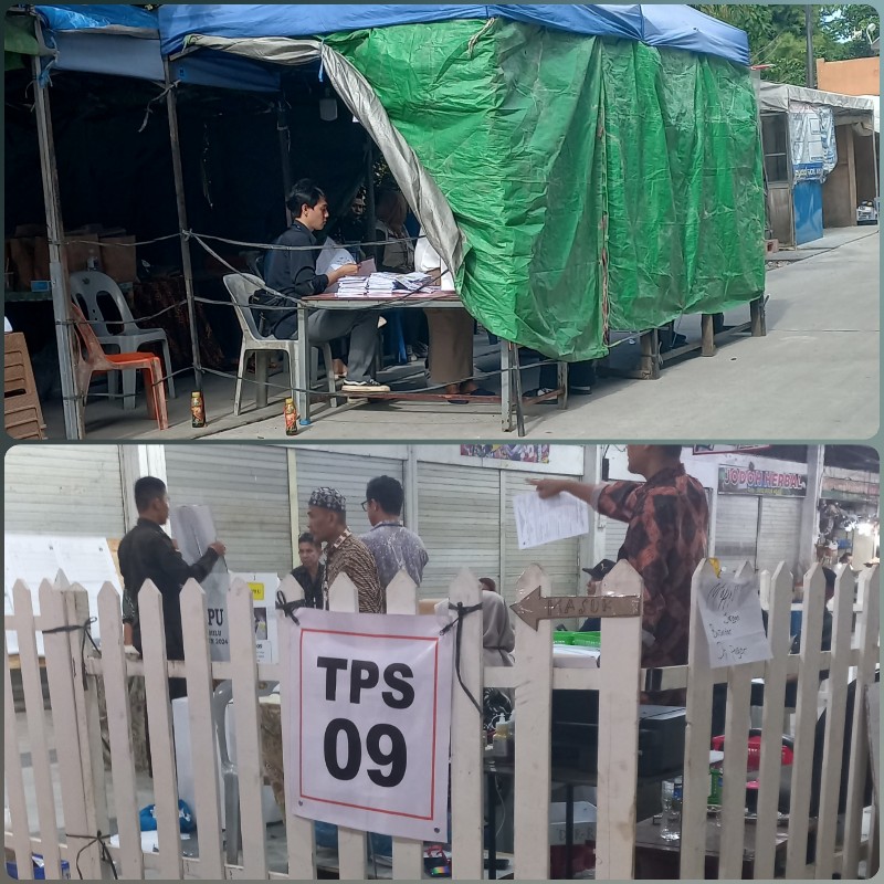 Foto : Terlihat Lokasi pemilihan di TPS 010 yang cukup memprihatinkan dengan menggunkan tenda bekas dan di tutupi terpal yang lusuh di Kawasan pasar seken Nagoya Kec Lubuk Baja, sedangkan gambar bawah TPS O9 tersembunyi di gelar didalam pasar Jodoh Baru ( Pantun)sehingga warga kelimpungan mencari untuk hadir mencoblos.( foto: Indralis – OpuNg)