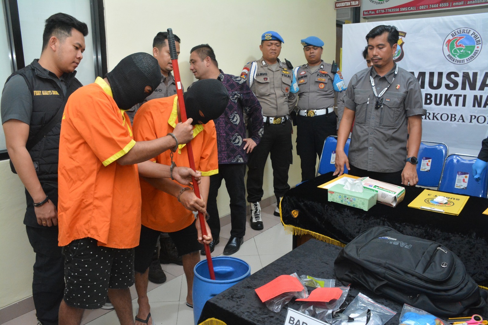 “Barang bukti narkotika jenis Sabu dimusnahkan dengan cara dilarutkan kedalam Tong air yang berisikan air panas lalu dibuang ke dalam Septic Tank yang disaksikan langsung oleh kedua tersangka dan tamu undangan dari Perwakilan Kejaksaan Negeri Batam, Perwakilan BPOM Kota Batam, Pengadilan Negeri Batam, LSM Granat, dan Advokat.