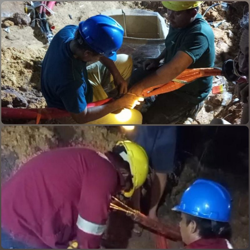 Selanjutnya, dilakukan perbaikan terhadap kabel yang putus dengan mengupas kabel, dan kemudian menyambungkan kembali serta menutup sambungan dengan menggunakan resin.