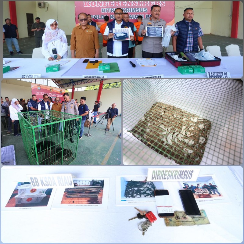 Kepri.( BATAM Expose.Com ). ————! Sebagai bentuk Komitmen Polda Kepri dalam menjaga kelestarian Hewan yang dilindungi, Ditreskrimsus Polda Kepri berhasil Ungkap kasus Penyelundupan hewan serta amankan 3 orang tersangka dalam kasus penyelundupan hewan yang dilindungi yang dipimpin oleh Dirreskrimsus Polda Kepri Kombes. Pol. Putu Yudha Prawira, S.I.K., M.H., didampingi oleh Kabidhumas Polda Kepri Kombes. Pol. Zahwani Pandra Arsyad, S.H. M.Si., Wadirreskrimsus AKBP Ade Kuncoro Ridwan, S.I.K., Kasubdit 4 Tipidter Ditreskrimsus Polda Kepri Kompol Zamrul Aini, S.H., S.I.K., M.H., M.B.A., dan Kabid Konservasi Wilayah 1 Balai besar KSDA Riau Amri, S.H., bertempat di Hanggar Cakra Buana Samapta Polda Kepri. Kamis (30/5/2024).