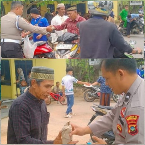 Kebersamaan tersebut berlanjut seusai ibadah, saat jajaran kepolisian membagikan 40 paket nasi bungkus kepada warga di sekitar masjid.