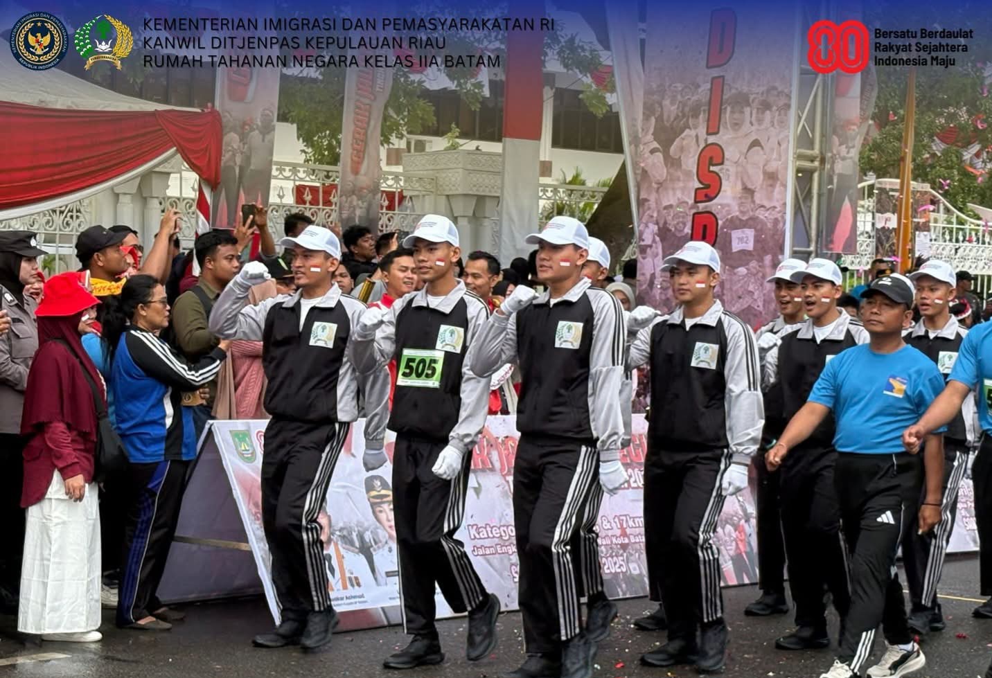 Rutan Barelang. – ( BATAM Expose.Com).———— ! Rumah Tahanan Negara Kelas IIA Batam turut memeriahkan peringatan Hari Kemerdekaan Republik Indonesia ke-80 dengan mengikuti kegiatan Gerak Jalan Beregu 17 KM, yang digelar oleh Pemerintah Kota Batam, Sabtu (23/8) pagi berjalan.lancar.