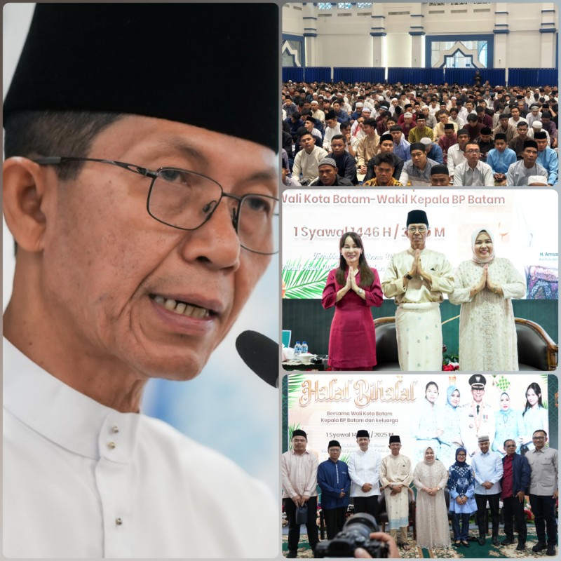 . ———– ! Kepala BP Batam/Walikota Batam, Amsakar Achmad menghadiri pelaksanaan shalat Idul Fitri berjamaah bersama ribuan umat muslim Kota Batam pada Senin (31/3/2025).