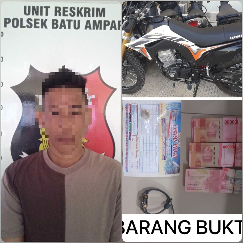 “Barang bukti tersebut antara lain seperti 1 unit sepeda motor Merk Honda CRF Warna Hitam Putih, 1 unit Handphone Merk Oppo Warna Biru, 1 buah jam tangan warna hitam, 1 buah kalung perak, 1 buah cincin emas dan Uang tunai Rp. 30.000.000 pecahan Rp.100.000” Ungkap Kapolsek Batu Ampar Kompol Dwihatmoko Wiroseno, S.H., S.I.K., M.M.